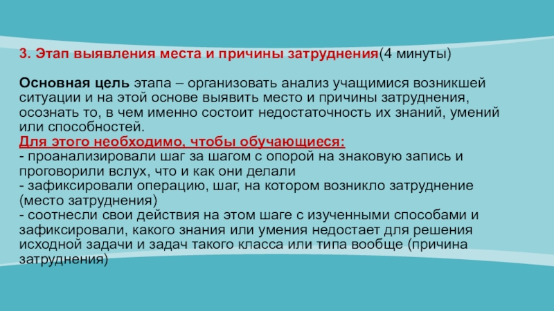 анализ учащимися возникшей ситуации и на этой основе выявить место и причины затруднения, осознать то, в чем именно состоит недостаточность их знаний, умений или способностей.