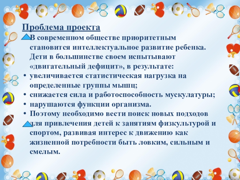 Поэтому необходимо вести поиск новых подходов для привлечения детей к занятиям физкультурой и спортом, развивая интерес к движению как жизненной потребности быть ловким, сильным и смелым.