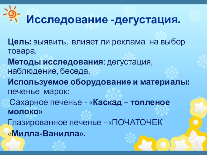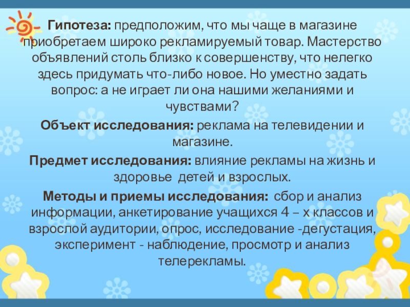Методы и приемы исследования: сбор и анализ информации, анкетирование учащихся 4 – х классов и взрослой аудитории, опрос, исследование -дегустация, эксперимент - наблюдение, просмотр и анализ телерекламы.