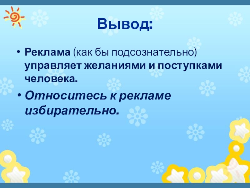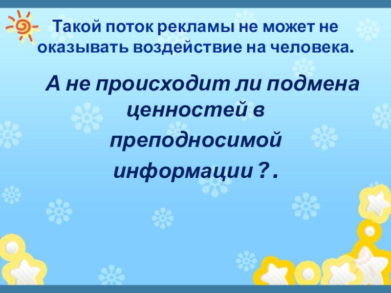 Слайд 12Такой поток рекламы не может не оказывать воздействие на человека.