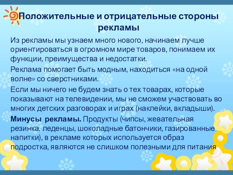 Минусы рекламы. Продукты (чипсы, жевательная резинка, леденцы, шоколадные батончики, газированные напитки), в рекламе которых используется образ подростка, являются не слишком полезными для питания