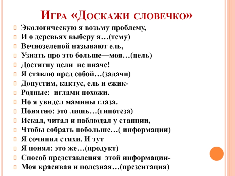 Игра «Доскажи словечко»Экологическую я возьму проблему,И о деревьях выберу я…(тему)Вечнозеленой называют ель,Узнать про это больше—моя…(цель)Достигну цели не