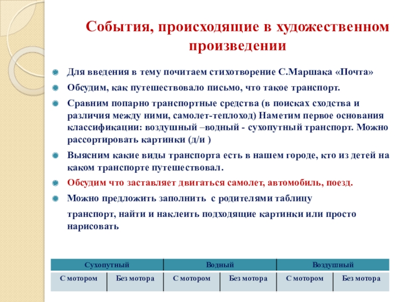 Сравним попарно транспортные средства (в поисках сходства и различия между ними, самолет-теплоход) Наметим первое основания классификации: воздушный –водный - сухопутный транспорт. Можно рассортировать картинки (д/и )
