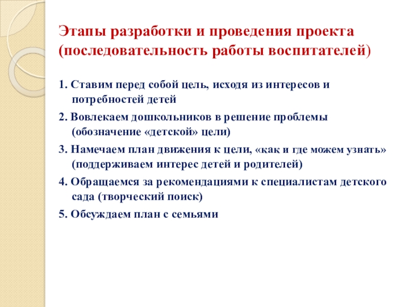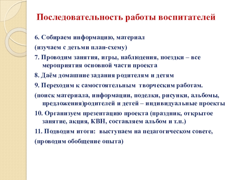 Слайд 8Этапы разработки и проведения проекта (последовательность работы воспитателей)