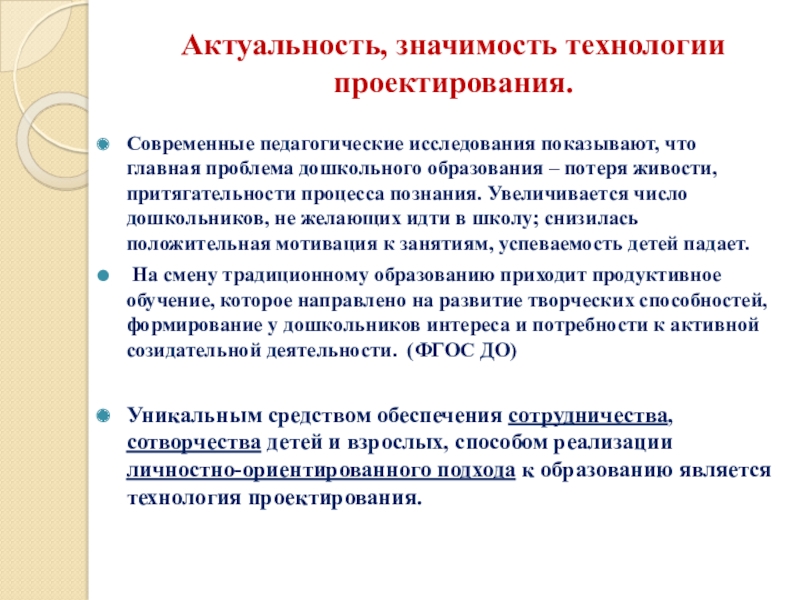 Уникальным средством обеспечения сотрудничества, сотворчества детей и взрослых, способом реализации личностно-ориентированного подхода к образованию является технология проектирования.
