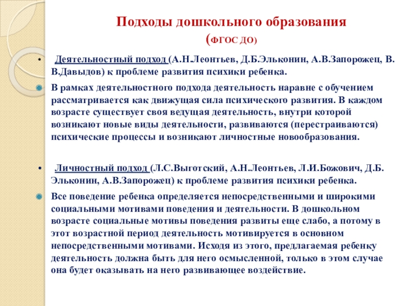 • Деятельностный подход (А.Н.Леонтьев, Д.Б.Эльконин, А.В.Запорожец, В.В.Давыдов) к проблеме