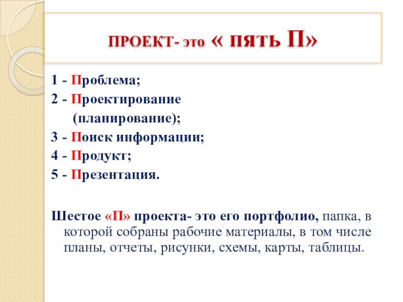 Шестое «П» проекта- это его портфолио, папка, в которой собраны рабочие материалы, в том числе планы, отчеты, рисунки, схемы, карты, таблицы.