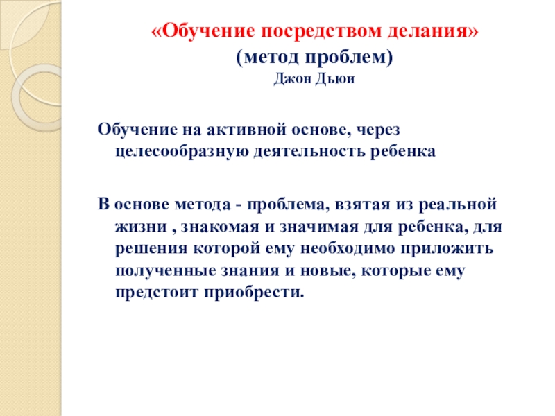 В основе метода - проблема, взятая из реальной жизни , знакомая и значимая для ребенка, для решения которой ему необходимо приложить полученные знания и новые, которые ему предстоит приобрести.