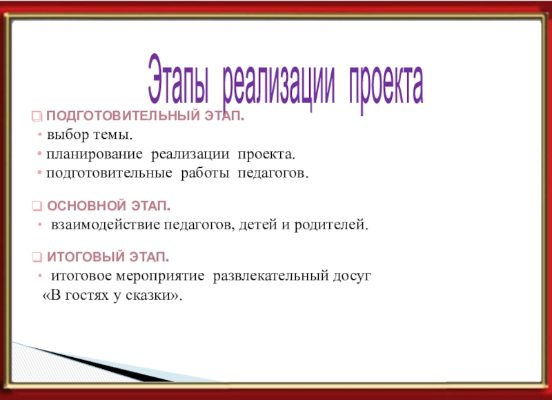 ЭТАПЫ ОСУЩЕСТВЛЕНИЯ ПРОЕКТА.I I I заключительныйРазвлекательный досуг «В гостях у сказки».