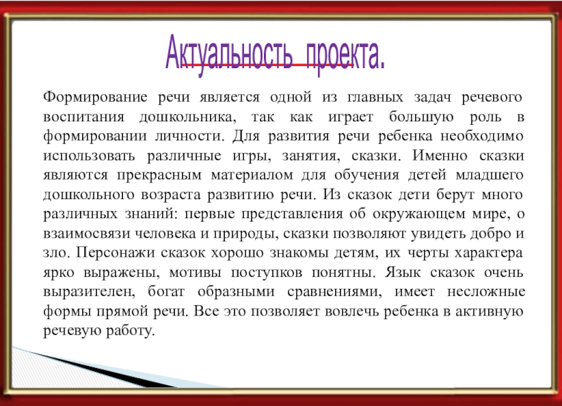 Актуальность проекта.Формирование речи является одной из главных задач речевого воспитания дошкольника, так как играет большую роль в формировании личности. Для развития речи ребенка необходимо использовать различные игры, занятия, сказки. Именно сказки являются прекрасным материалом для обучения