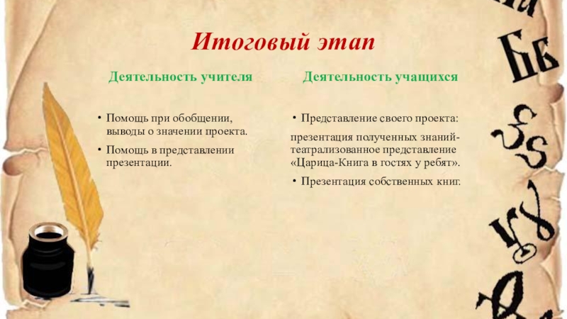 презентация полученных знаний- театрализованное представление «Царица-Книга в гостях у ребят».