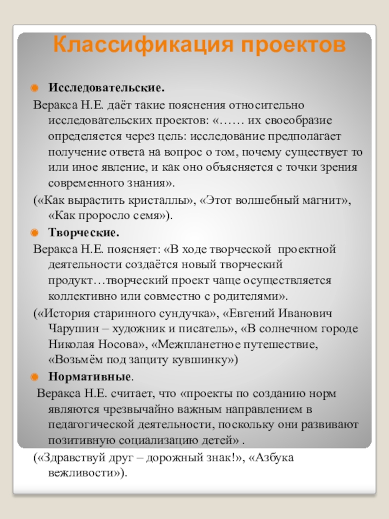 Веракса Н.Е. поясняет: «В ходе творческой проектной деятельности создаётся новый творческий продукт…творческий проект чаще осуществляется коллективно или совместно с родителями».