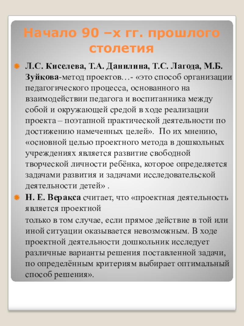 М.Б. Зуйкова-метод проектов…- «это способ организации педагогического процесса, основанного на взаимодействии педагога и воспитанника между собой и окружающей средой в ходе реализации проекта – поэтапной практической деятельности по достижению намеченных целей». По их мнению, «основной целью проектного метода в дошкольных учреждениях является развитие свободной творческой личности ребёнка, которое определяется задачами развития и задачами исследовательской деятельности детей» .