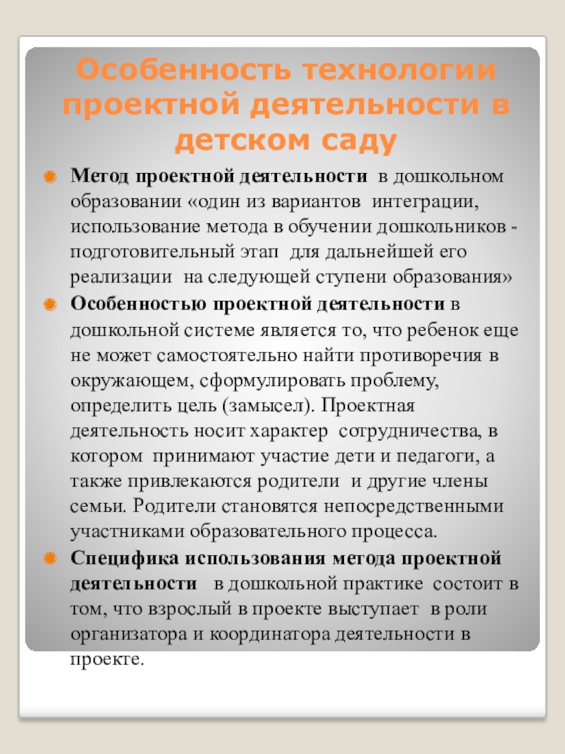 Особенностью проектной деятельности в дошкольной системе является то, что ребенок еще не может самостоятельно найти противоречия в окружающем, сформулировать проблему, определить цель (замысел). Проектная деятельность носит характер сотрудничества, в котором принимают участие дети и педагоги, а также привлекаются родители и другие члены семьи. Родители становятся непосредственными участниками образовательного процесса.
