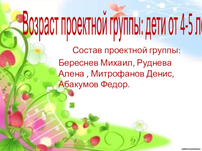 Возраст проектной группы: дети от 4-5 летСостав проектной группы:Береснев Михаил, Руднева Алена , Митрофанов Денис, Абакумов Федор.