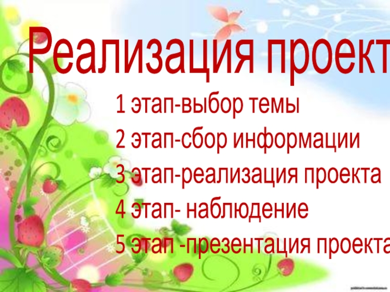 Реализация проекта1 этап-выбор темы2 этап-сбор информации3 этап-реализация проекта4 этап- наблюдение5 этап -презентация проекта
