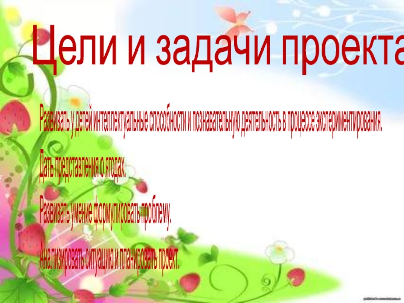 Цели и задачи проектаРазвивать у детей интеллектуальные способности и познавательную деятельность в процессе экспериментирования.Дать представления о ягодах.Развивать