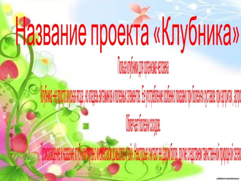 Название проекта «Клубника»Польза клубники для организма человекаКлубника –не просто вкусная ягода , но кладезь витаминов и полезных