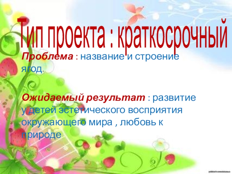 Тип проекта : краткосрочныйПроблема : название и строение ягод. Ожидаемый результат : развитие у детей эстетического восприятия