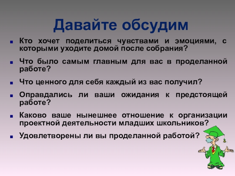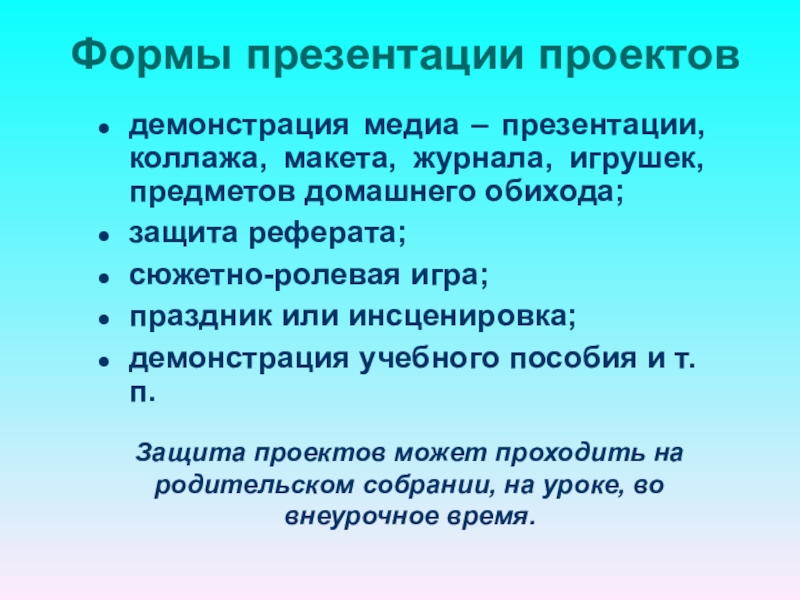 Защита проектов может проходить на родительском собрании, на уроке, во внеурочное время.