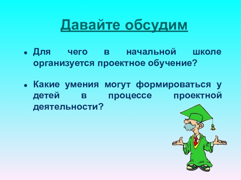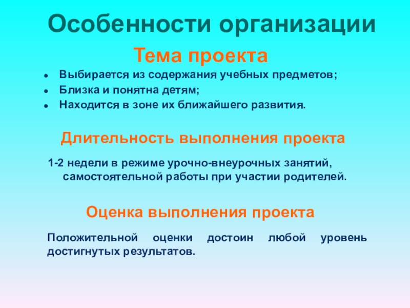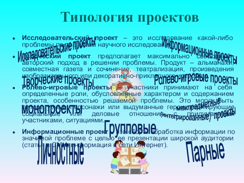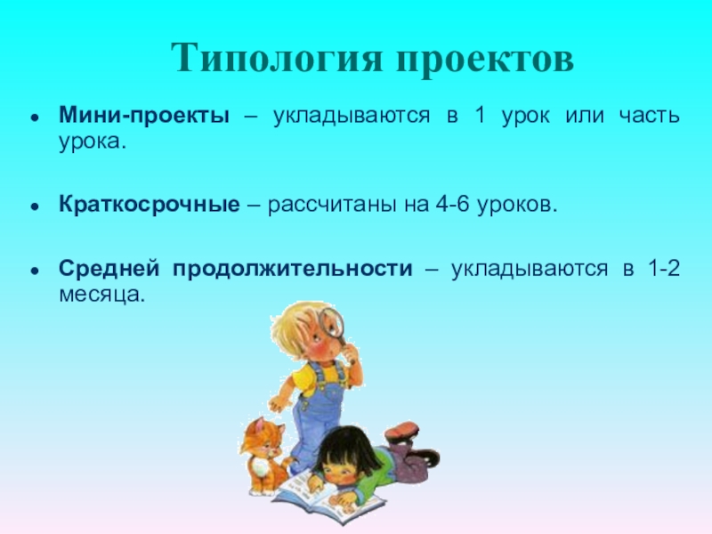 Это могут быть небольшие проекты, затрагивающие две-три предметные области, а могут быть достаточно объемные, продолжительные. Разделы (темы) программ по разным учебным предметам группируются вокруг проекта.