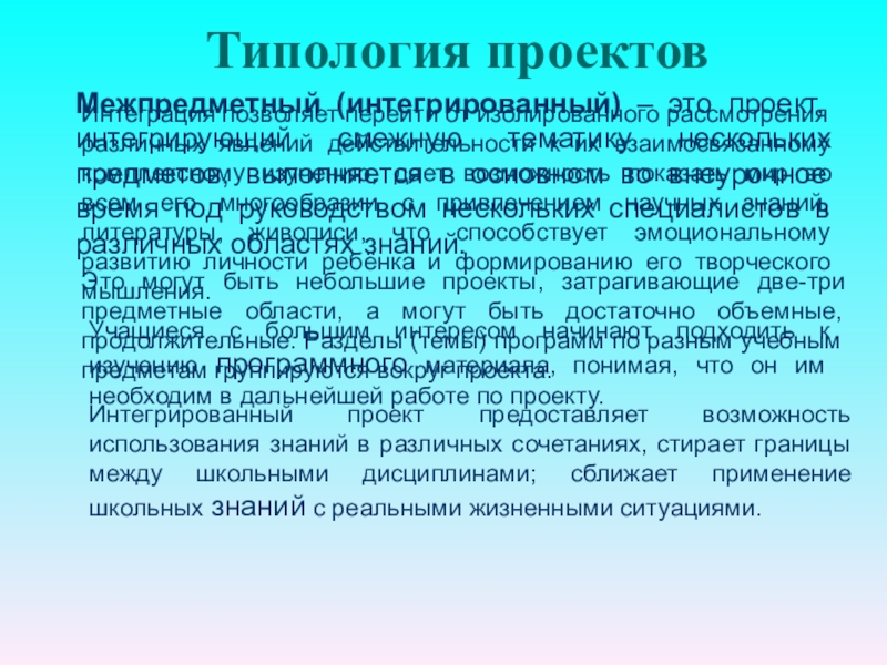 Интегрированный проект предоставляет возможность использования знаний в различных сочетаниях, стирает границы между школьными дисциплинами; сближает применение школьных знаний с реальными жизненными ситуациями.