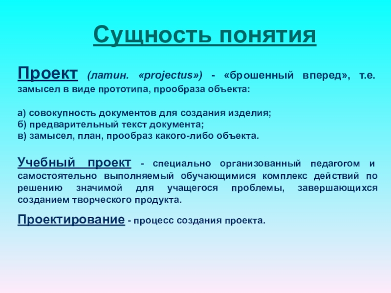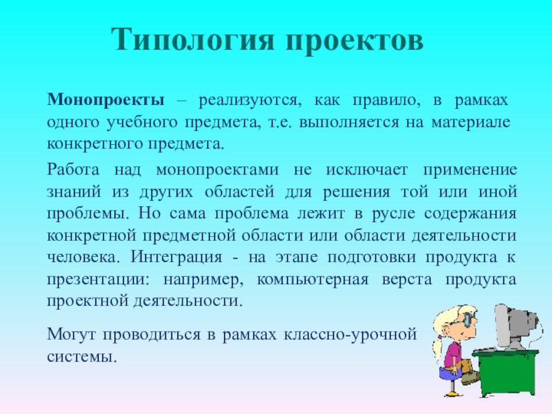 Работа над монопроектами не исключает применение знаний из других областей для решения той или иной проблемы. Но сама проблема лежит в русле содержания конкретной предметной области или области деятельности человека. Интеграция - на этапе подготовки продукта к презентации: например, компьютерная верста продукта проектной деятельности.