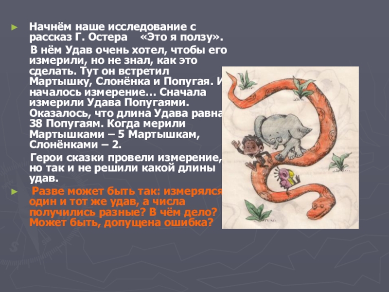 Слайд 18Начнём наше исследование с рассказ Г. Остера «Это я ползу».