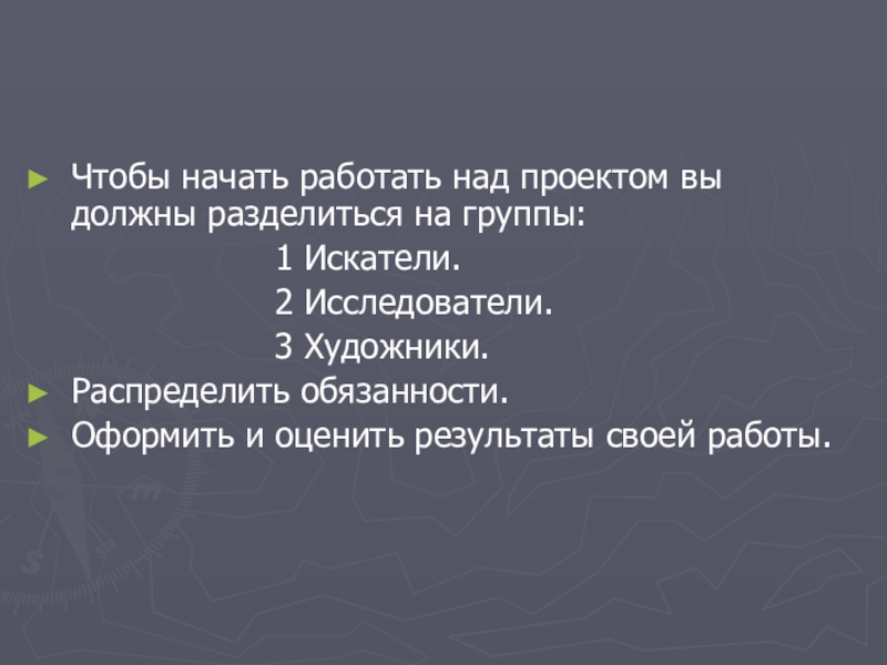 Слайд 15Чтобы начать работать над проектом вы должны разделиться на группы: