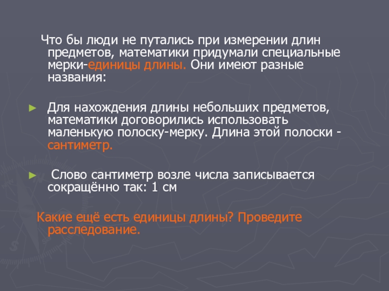 Для нахождения длины небольших предметов, математики договорились использовать маленькую полоску-мерку. Длина этой полоски - сантиметр.
