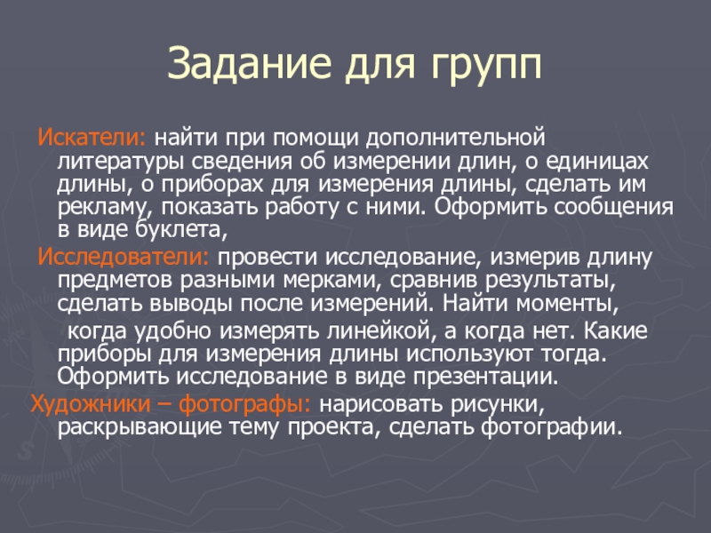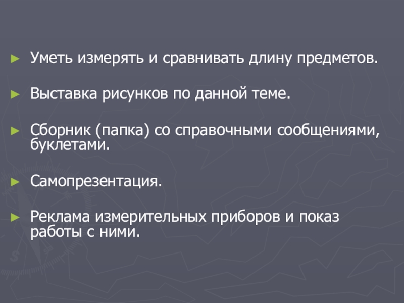 измерении длин, о единицах длины, о приборах для измерения длины, сделать им рекламу, показать работу с ними. Оформить сообщения в виде буклета,