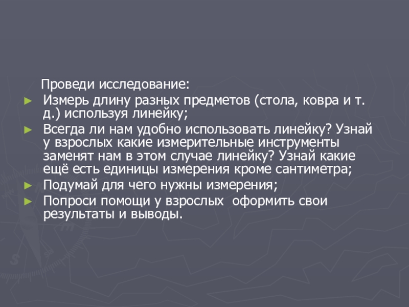 Всегда ли нам удобно использовать линейку? Узнай у взрослых какие измерительные инструменты заменят нам в этом случае линейку? Узнай какие ещё есть единицы измерения кроме сантиметра;