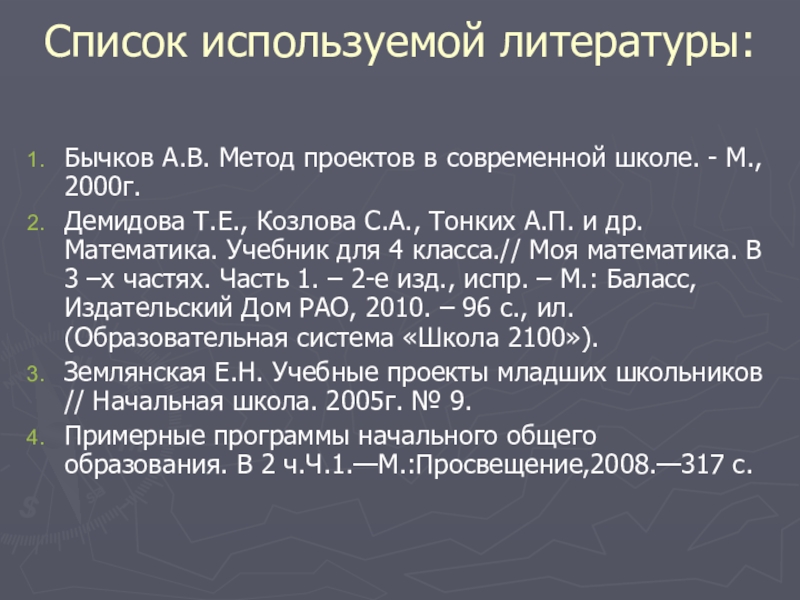 Землянская Е.Н. Учебные проекты младших школьников // Начальная школа. 2005г. № 9.