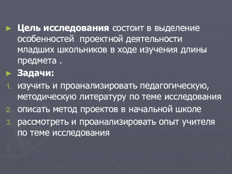 Слайд 2Цель исследования состоит в выделение особенностей проектной деятельности младших школьников в