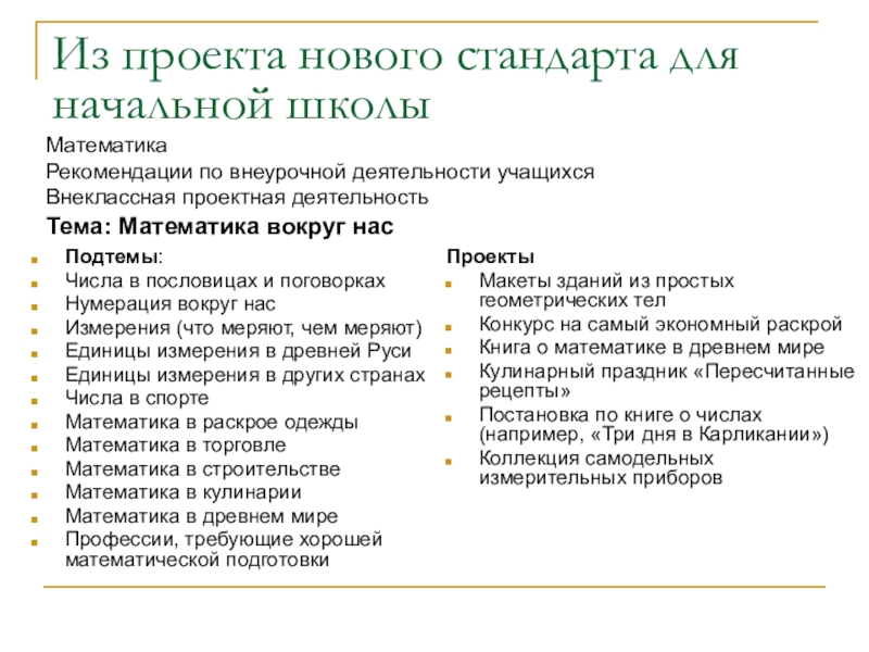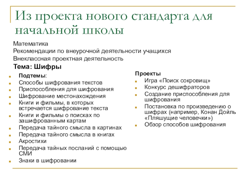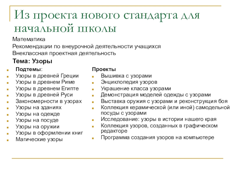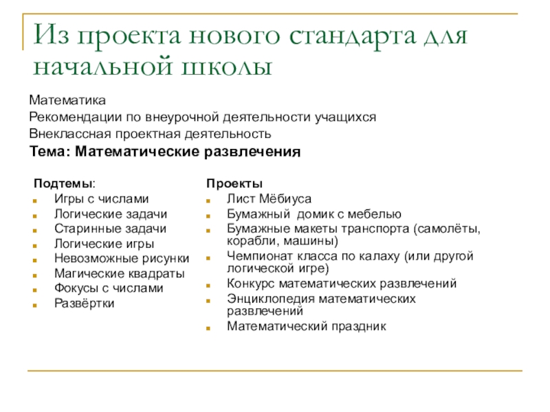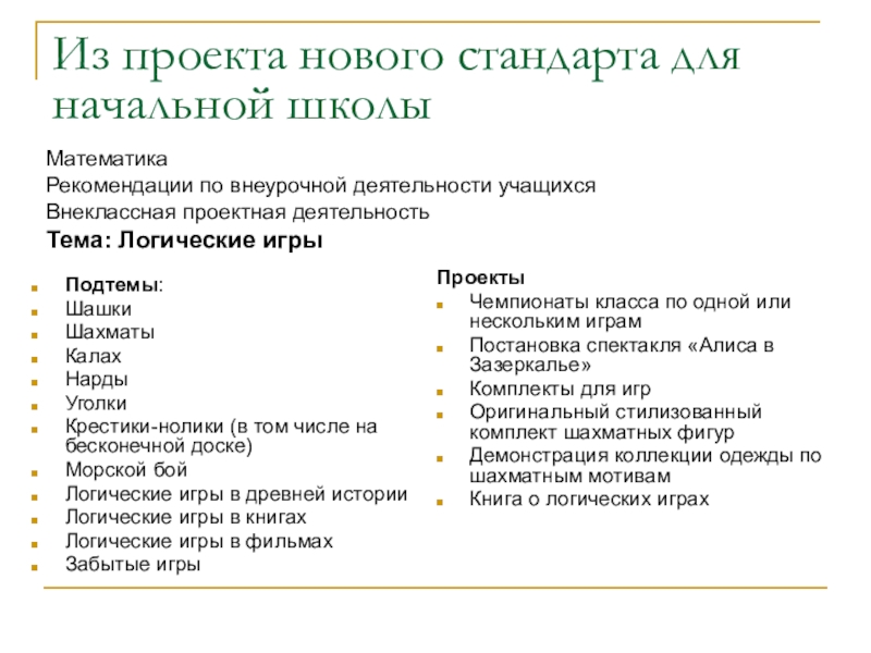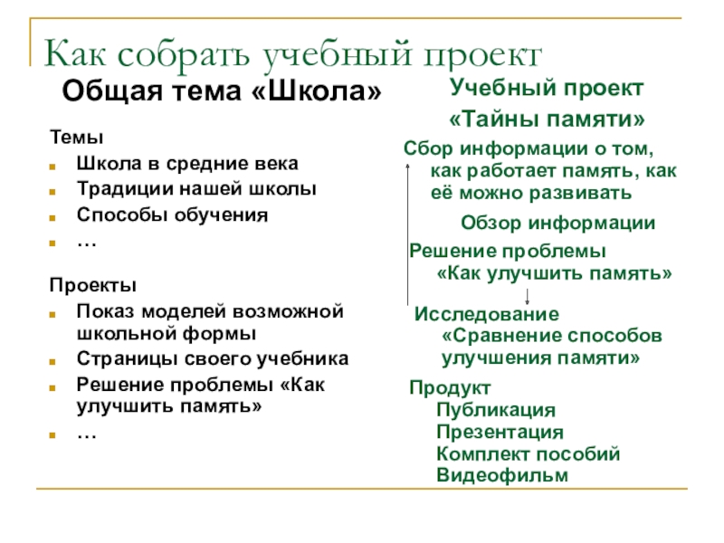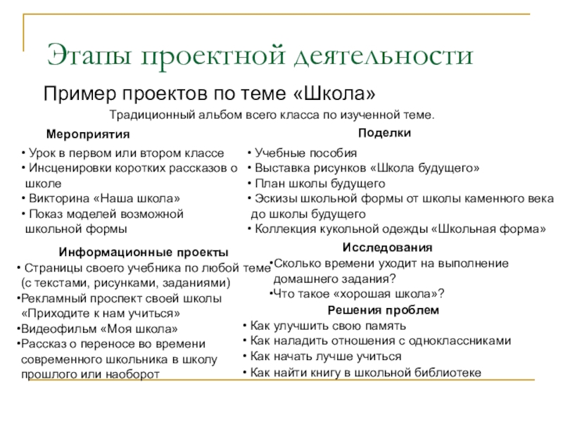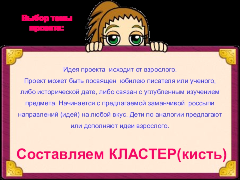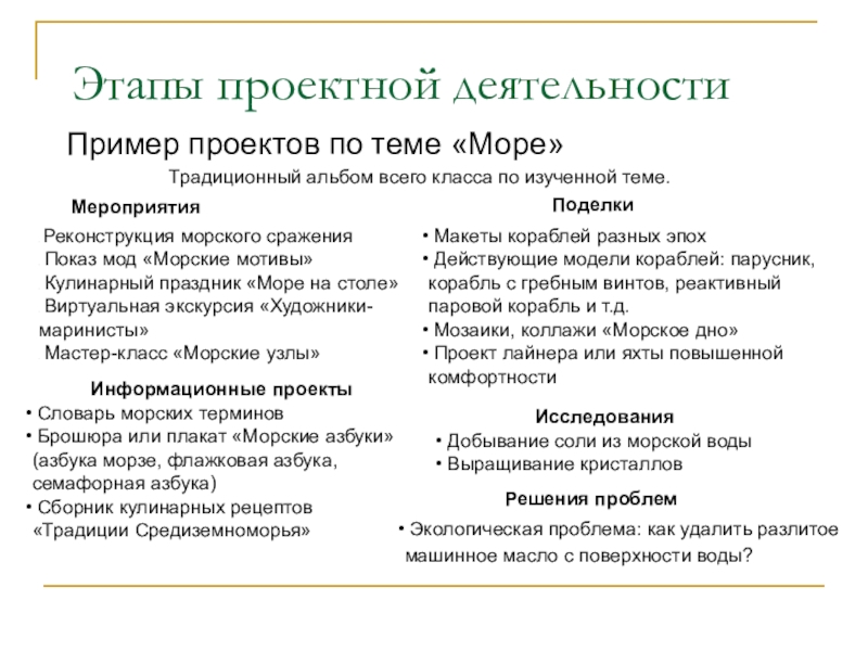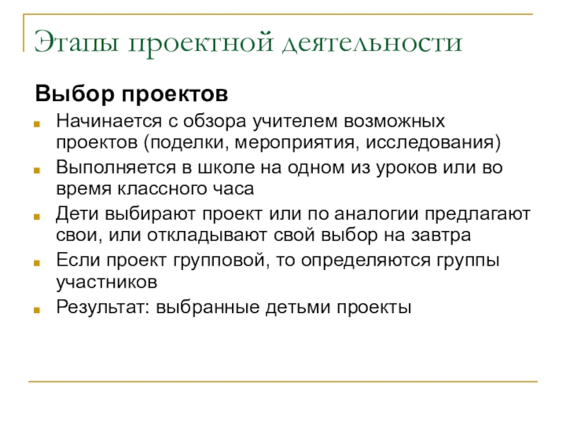 либо исторической дате, либо связан с углубленным изучением предмета. Начинается с предлагаемой заманчивой россыпи направлений (идей) на любой вкус. Дети по аналогии предлагают или дополняют идеи взрослого.