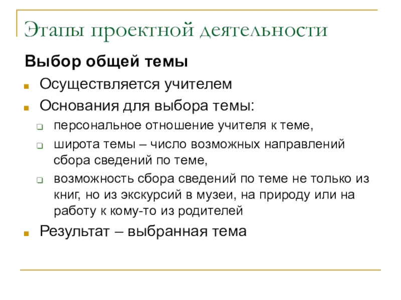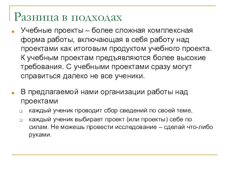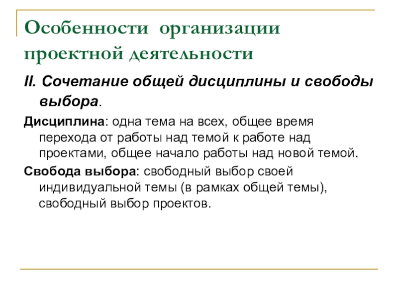 Свобода выбора: свободный выбор своей индивидуальной темы (в рамках общей темы), свободный выбор проектов.
