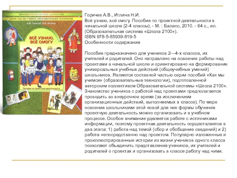 Пособие предназначено для учеников 2—4-х классов, их учителей и родителей. Оно направлено на освоение работы над проектами в начальной школе и ориентировано на формирование универсальных учебных действий (общеучебных умений) школьников. Является составной частью серии пособий «Как мы учимся» (образовательные технологии), подготовленной авторским коллективом Образовательной системы «Школа 2100». Знакомство учеников с работой над проектами предполагается проводить во внеурочное время (за исключением организационных действий, выполняемых в классе). По мере освоения школьниками этой новой для них формы обучения проектную деятельность можно организовать и в учебном процессе. Особое внимание уделяется работе с источниками информации, поэтому проектная деятельность осуществляется в два этапа: 1) работа над темой (сбор и обобщение сведений) и 2) работа непосредственно над проектом. Популярно изложенные и проиллюстрированные истории из жизни учеников одного класса позволяют объединить представления учеников, их учителей и родителей о проектах и организовать в классе работу над ними.