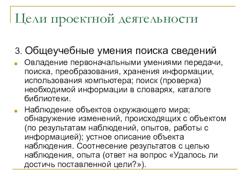 Наблюдение объектов окружающего мира; обнаружение изменений, происходящих с объектом (по результатам наблюдений, опытов, работы с информацией); устное описание объекта наблюдения. Соотнесение результатов с целью наблюдения, опыта (ответ на вопрос «Удалось ли достичь поставленной цели?»).