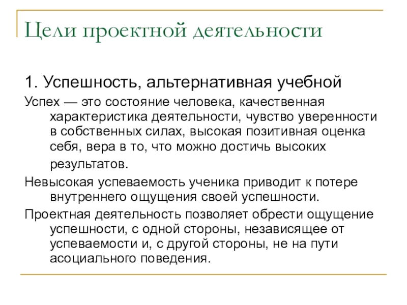 Проектная деятельность позволяет обрести ощущение успешности, с одной стороны, независящее от успеваемости и, с другой стороны, не на пути асоциального поведения.