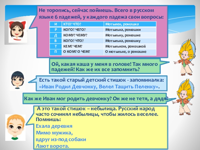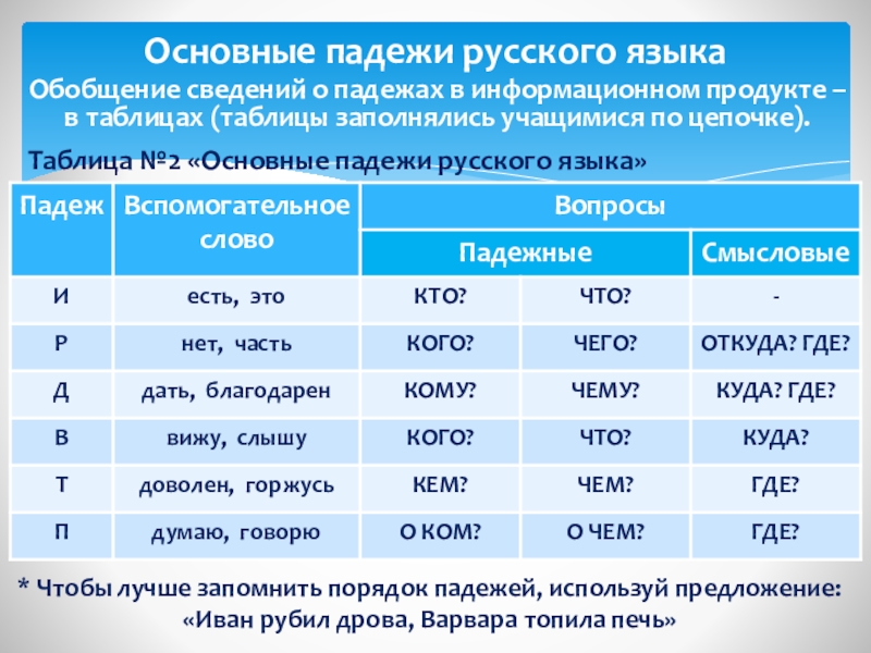 * Чтобы лучше запомнить порядок падежей, используй предложение: «Иван рубил дрова, Варвара топила печь»