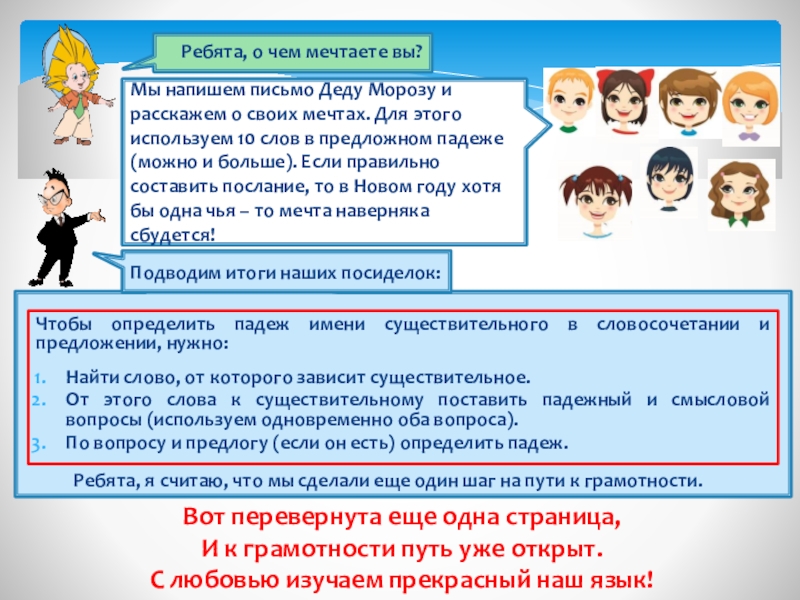 Мы напишем письмо Деду Морозу и расскажем о своих мечтах. Для этого используем 10 слов в предложном падеже (можно и больше). Если правильно составить послание, то в Новом году хотя бы одна чья – то мечта наверняка сбудется!