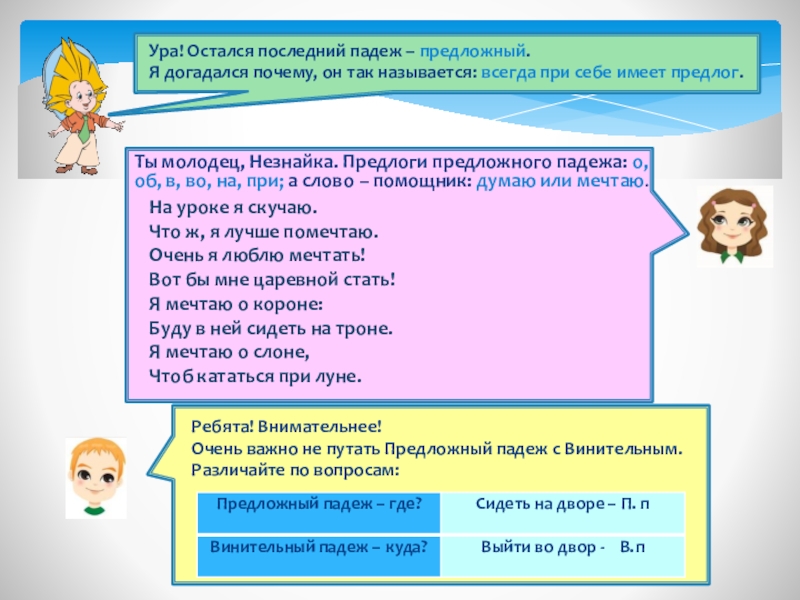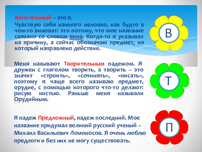 Я падеж Предложный, падеж последний. Мое название придумал великий русский ученый – Михаил Васильевич Ломоносов. Я очень люблю предлоги и без них не могу существовать.