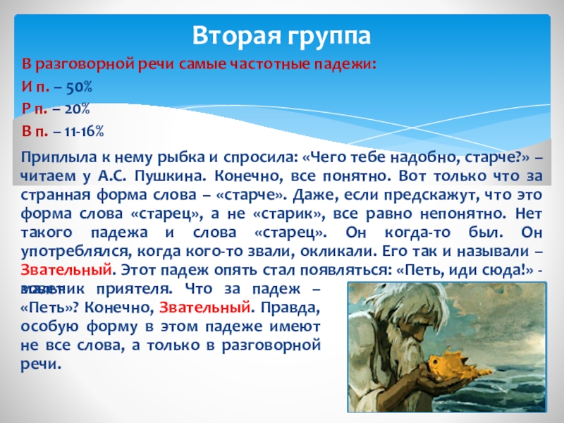 Приплыла к нему рыбка и спросила: «Чего тебе надобно, старче?» – читаем у А.С. Пушкина. Конечно, все понятно. Вот только что за странная форма слова – «старче». Даже, если предскажут, что это форма слова «старец», а не «старик», все равно непонятно. Нет такого падежа и слова «старец». Он когда-то был. Он употреблялся, когда кого-то звали, окликали. Его так и называли – Звательный. Этот падеж опять стал появляться: «Петь, иди сюда!» - зовет