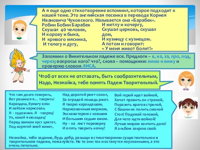Незнайка, тебе задание, будь добр, разыщи в стихотворении существительное в творительном падеже, пожалуйста. Не то они так и останутся неузнанными, а это очень печально.