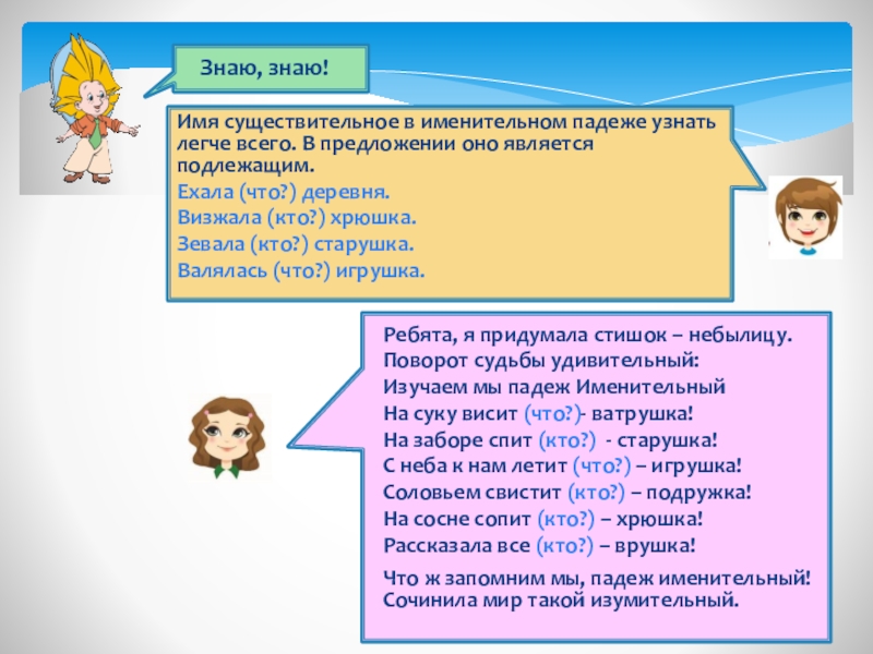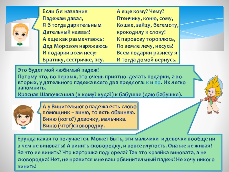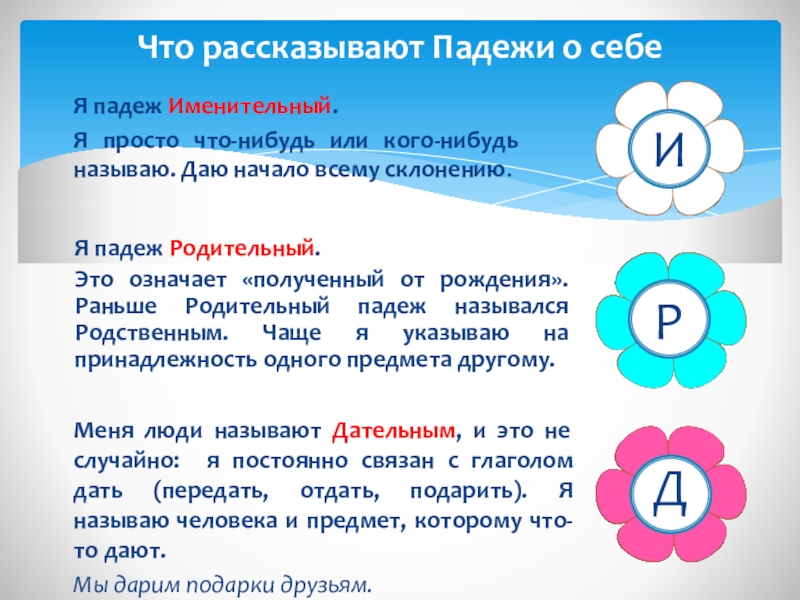 Меня люди называют Дательным, и это не случайно: я постоянно связан с глаголом дать (передать, отдать, подарить). Я называю человека и предмет, которому что-то дают.
