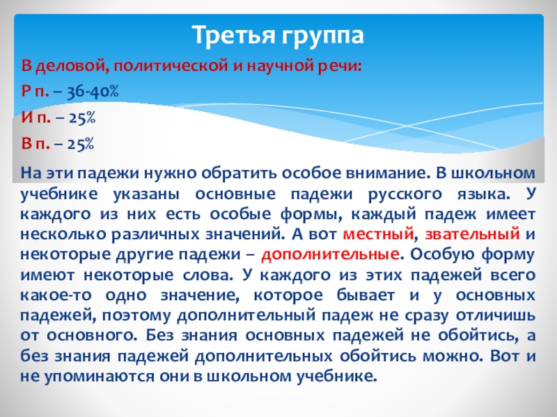 На эти падежи нужно обратить особое внимание. В школьном учебнике указаны основные падежи русского языка. У каждого из них есть особые формы, каждый падеж имеет несколько различных значений. А вот местный, звательный и некоторые другие падежи – дополнительные. Особую форму имеют некоторые слова. У каждого из этих падежей всего какое-то одно значение, которое бывает и у основных падежей, поэтому дополнительный падеж не сразу отличишь от основного. Без знания основных падежей не обойтись, а без знания падежей дополнительных обойтись можно. Вот и не упоминаются они в школьном учебнике.