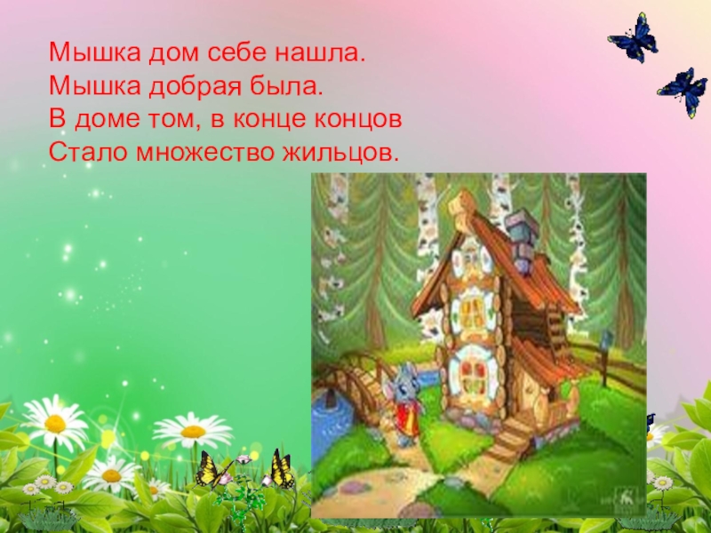 Мышка дом себе нашла.Мышка добрая была.В доме том, в конце концовСтало множество жильцов.