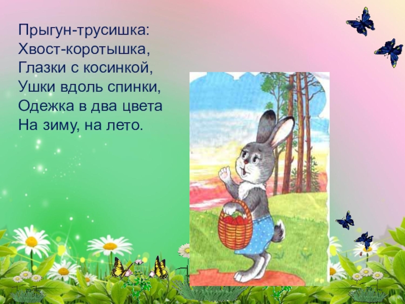 Слайд 14Прыгун-трусишка: Хвост-коротышка, Глазки с косинкой, Ушки вдоль спинки, Одежка в два цвета На зиму, на