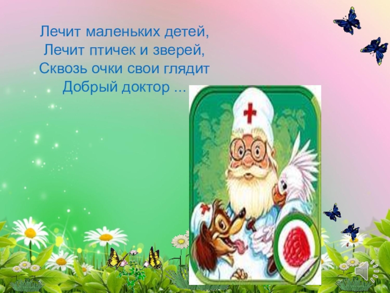 Лечит маленьких детей,  Лечит птичек и зверей,  Сквозь очки свои глядит  Добрый доктор ...