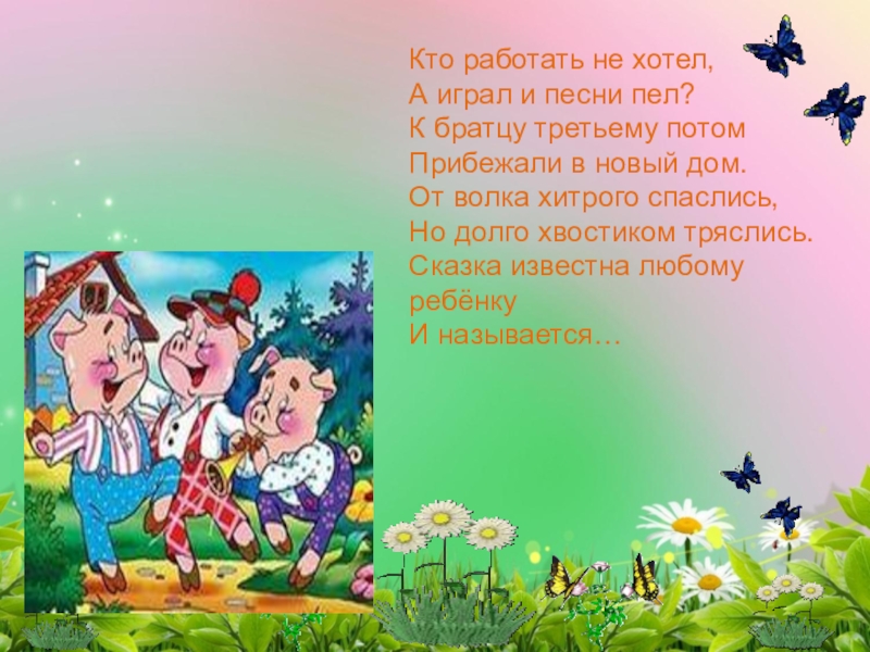 Кто работать не хотел,А играл и песни пел?К братцу третьему потомПрибежали в новый дом.От волка хитрого